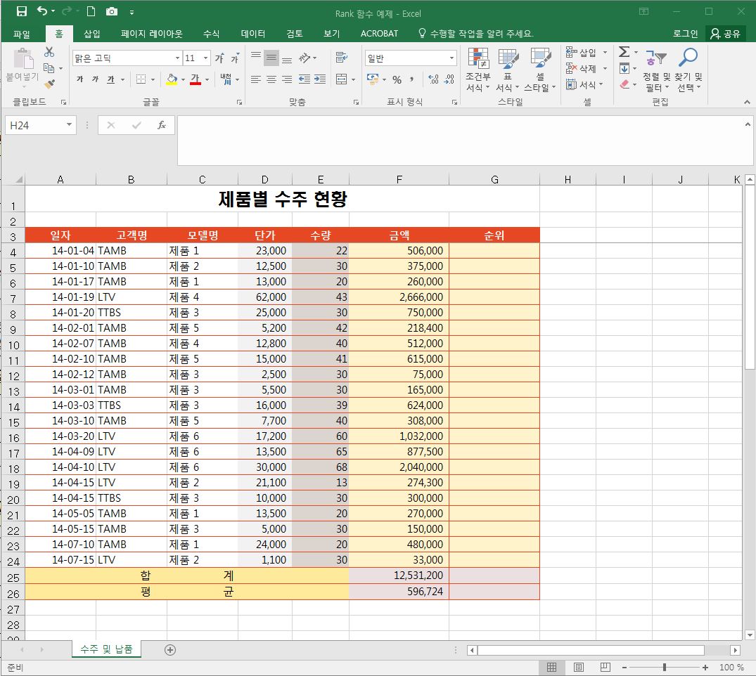 아래 제품별 수주 현황을 보실 수 있어요. 여기서수주 금액 순위를 rank 함수를 이용해서 간단하게 구해볼게요.