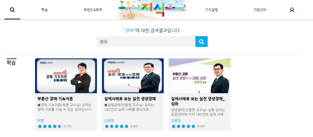 '경기도 지식'에는 부동산 관련 강의 말고도 유익한 강의들이 많이 제공 되고 있습니다. 특히나부동산 경매 관련 기초 부터 심화까지 강의가 무료로 제공되고 있습니다. 다른 곳에서 돈을 주고 봐야하는 인강을 무료로 볼 수 있으니 너무 좋습니다.