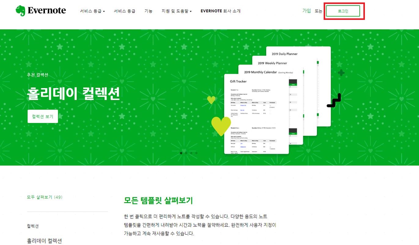 그럼 에버노트 샘플 템플릿 페이지(바로가기)에 들어갈 수 있어요. 로그인 버튼을 클릭해서 로그인해주세요.