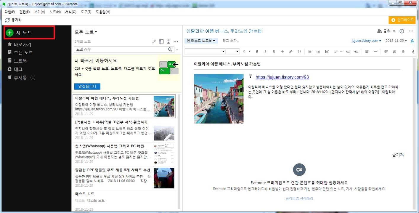 에버노트 템플릿 사용방법에 대해서 간단하게 알아볼게요. 먼저 앞서 설명드린 데로 에버노트 PC 버젼을 실행해주세요. 그 다음 새 노트를 클릭해주세요.
