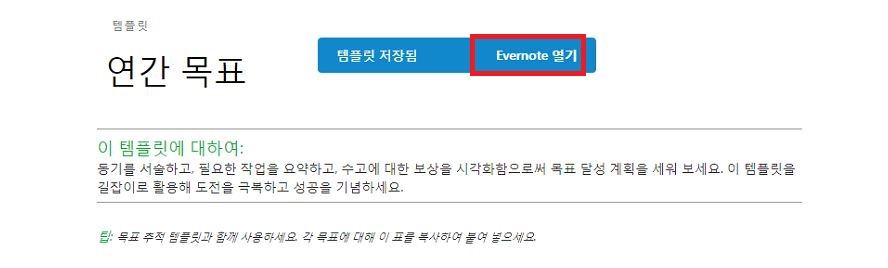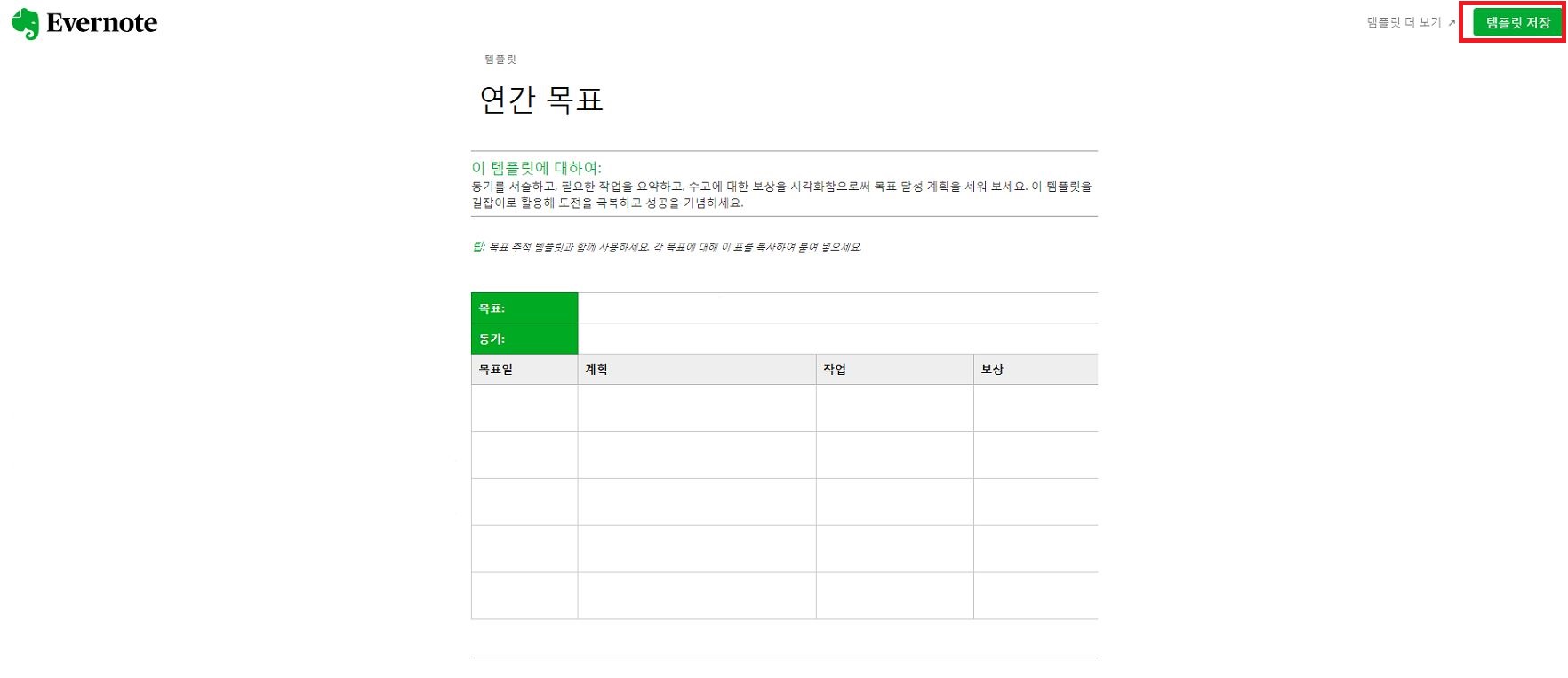 연간 목표 템플릿 페이지에서 오른쪽 위의 템플릿 저장을 클릭해 주시면 템플릿 저장이 완료됩니다.
