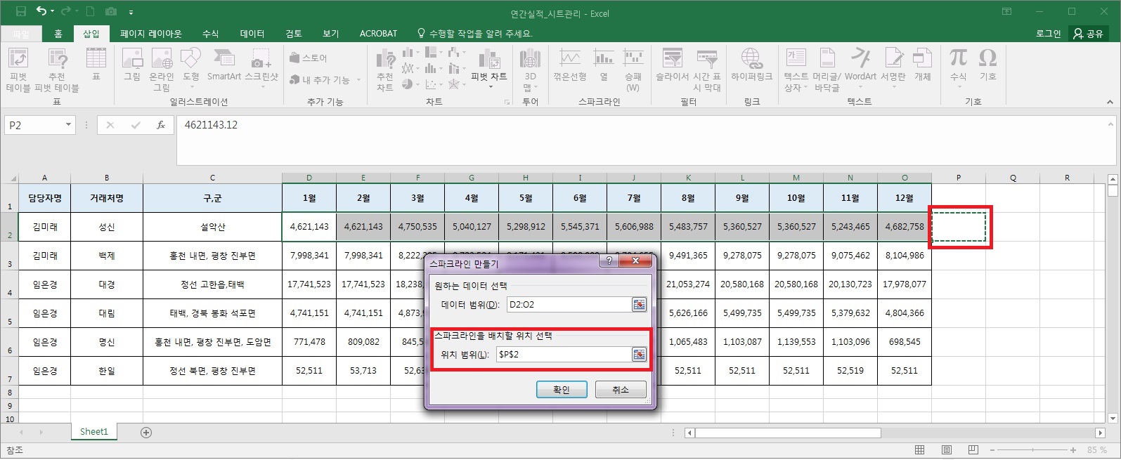 상단의 스파크라인 메뉴에서 꺽은선 형을 선택한 다음 만들기 위한 범위를 선택한 다음 스파크라인을 넣을 셀을 선택해주세요.