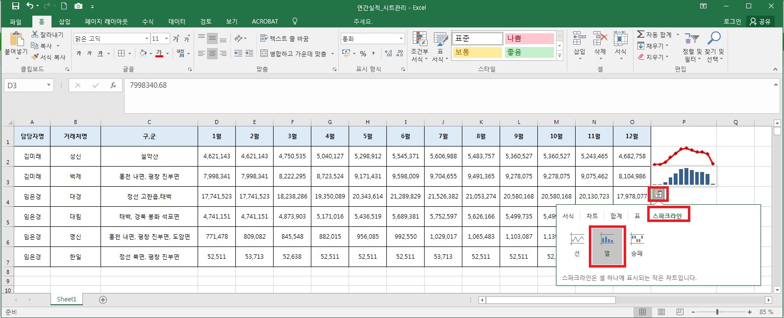 이번에는 다른 방법으로 열 스파크라인을 만들어 보도록 할게요. 범위를 선택한 다음 오른쪽에 생긴 버튼을 클릭하면 스파크라인을 볼 수 있어요. 여기서 열을 클릭하면 간단하게 만들 수 있답니다.
