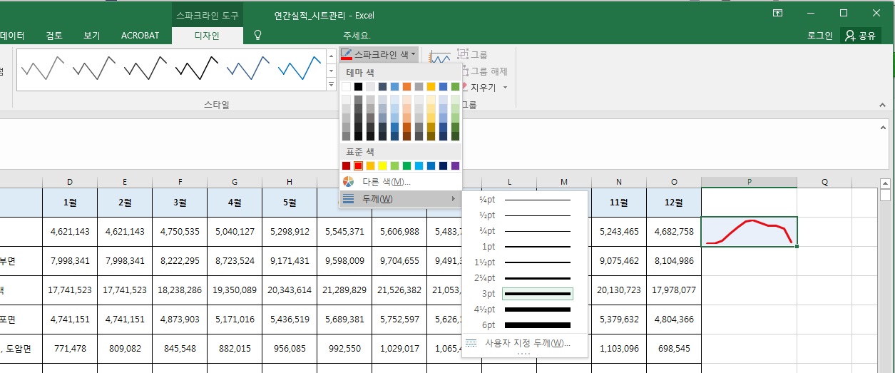 스파크라인이 생성된 셀을 선택한 다음 상단의 [디자인]을 클릭한 후 스파크라인 색과 두께를 변경할 수 있어요.