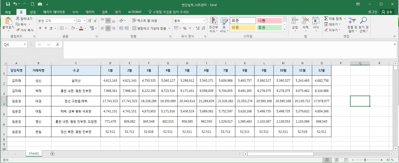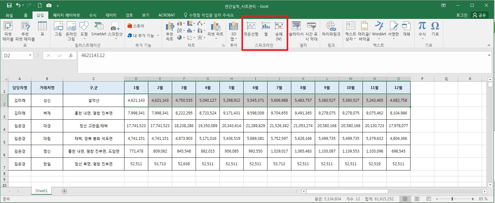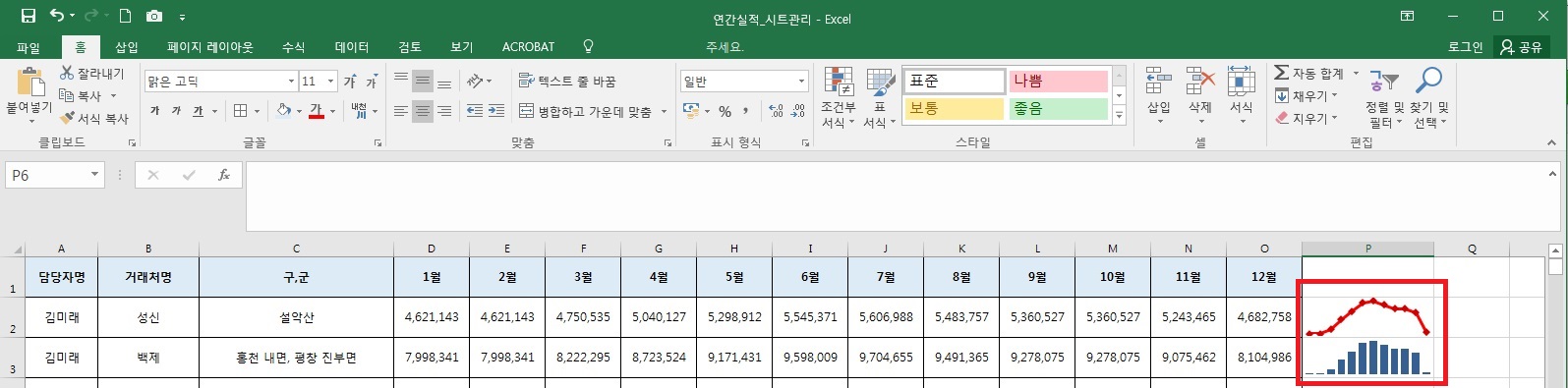 엑셀 예제파일을 다운로드 받으면 연간실적 표를 볼 수 있어요. 이 연간실적의 월별 흐름을 스파크라인 즉 미니 그래프를 이용해서 시각화해보도록 할게요.