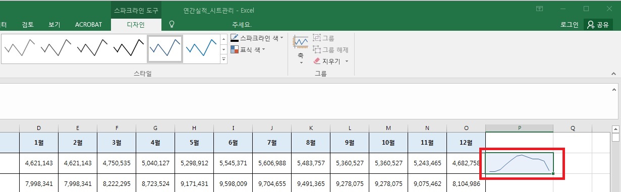 그럼 간단하게 꺽은선형 스파크라인이 만들어 진 것을 볼 수 있어요. 너무 귀여운 미니 그래프죠. 이렇게 데이터의 추세선을 보기 위해서 사용할 때 유용해요. 그래프 선이 너무 얇고 보기가 힘들죠.