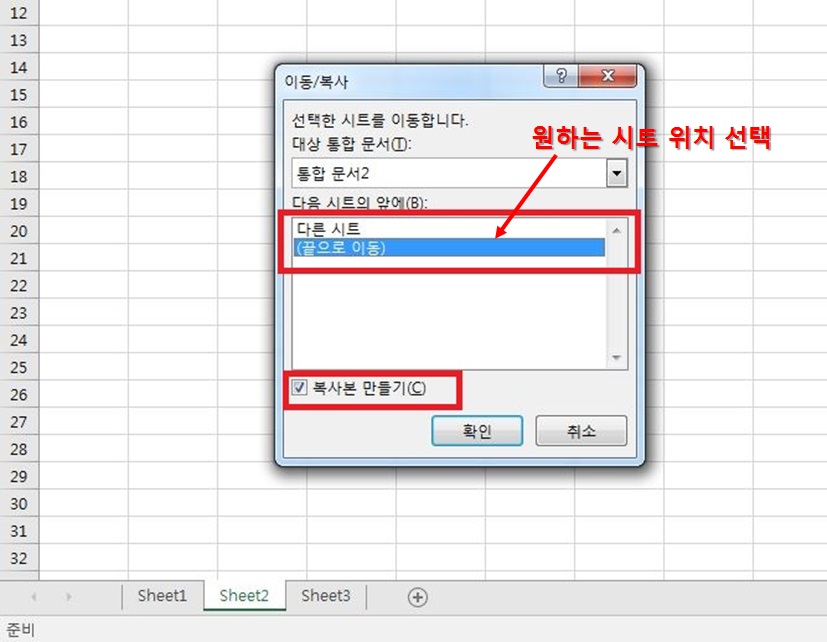 그리고 원하는 시트 위치를 끝으로 이동하고 복사본 만들기를 체크한 다음 확인을 클릭해주세요.