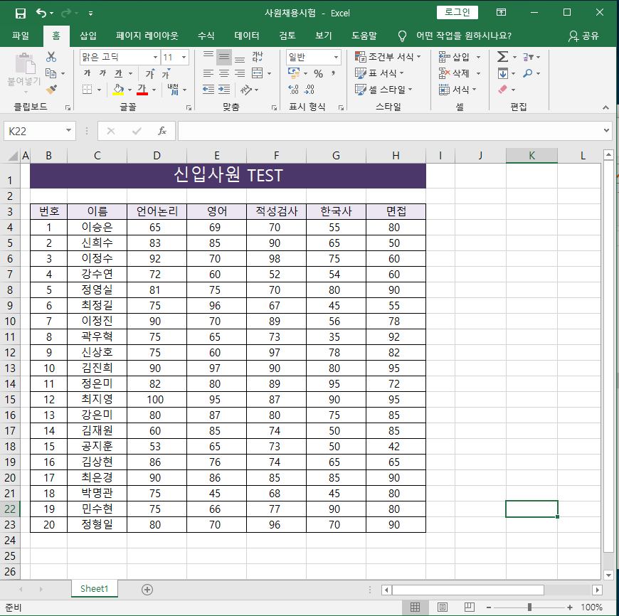 먼저 예제파일을 다운받으면 아래처럼 각 과목에 대한 점수들을 볼 수 있어요. 여기서 조건부 서식을 적용해서 원하는 자료를 찾아 보겠습니다.