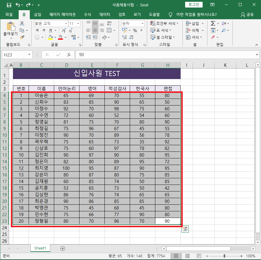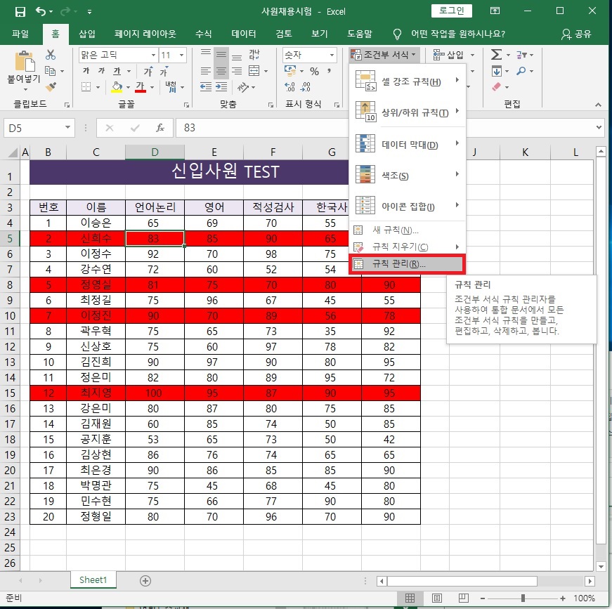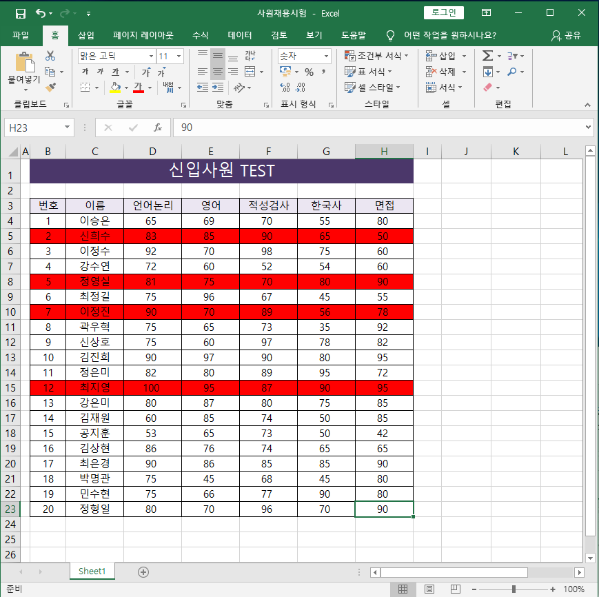그럼 아래 그림처럼 언어논리가 90점 이상인 행만 빨간색 서식이 지정된 것을 볼 수 있어요.