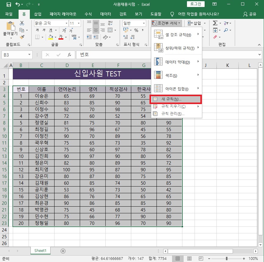 그 다음 [홈]-[조건부 서식]-[새 규칙]을 클릭해서 새로운 조건부 서식을 만들어 볼게요.