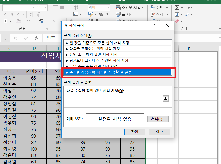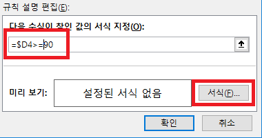 이제 이번 글에 가장 중요한 수식을 적용하는 것입니다. 여기서 수식은 언어논리 값이 90 이상인 셀 전체에 빨간색으로 서식을 적용하는 것입니다. 여기서 아래 서식 지정을 "=$D4>=90"으로 해주시면 됩니다. D앞에 절대 주소인 $가 붙음으로써 셀 전체에 빨간색 서식이 적용되는 것이지요.