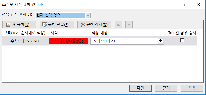 그럼 방금 지정한 조건부 서식을 볼 수 있습니다. 이 외에도 다른 조건부 서식을 지정 했다면 조건부 서식 규칙 관리자에서 한번에 볼 수 있습니다.