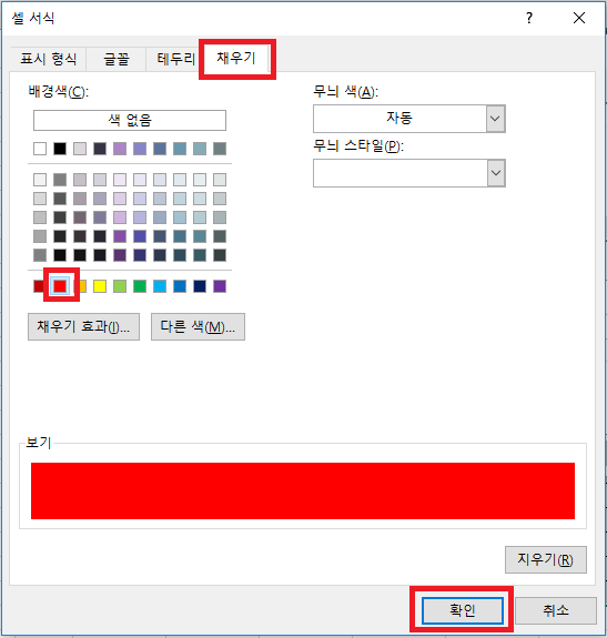 셀 서식 창에서 채우기 탭을 클릭한 후 빨간색을 선택한 다음 확인을 클릭해주세요.