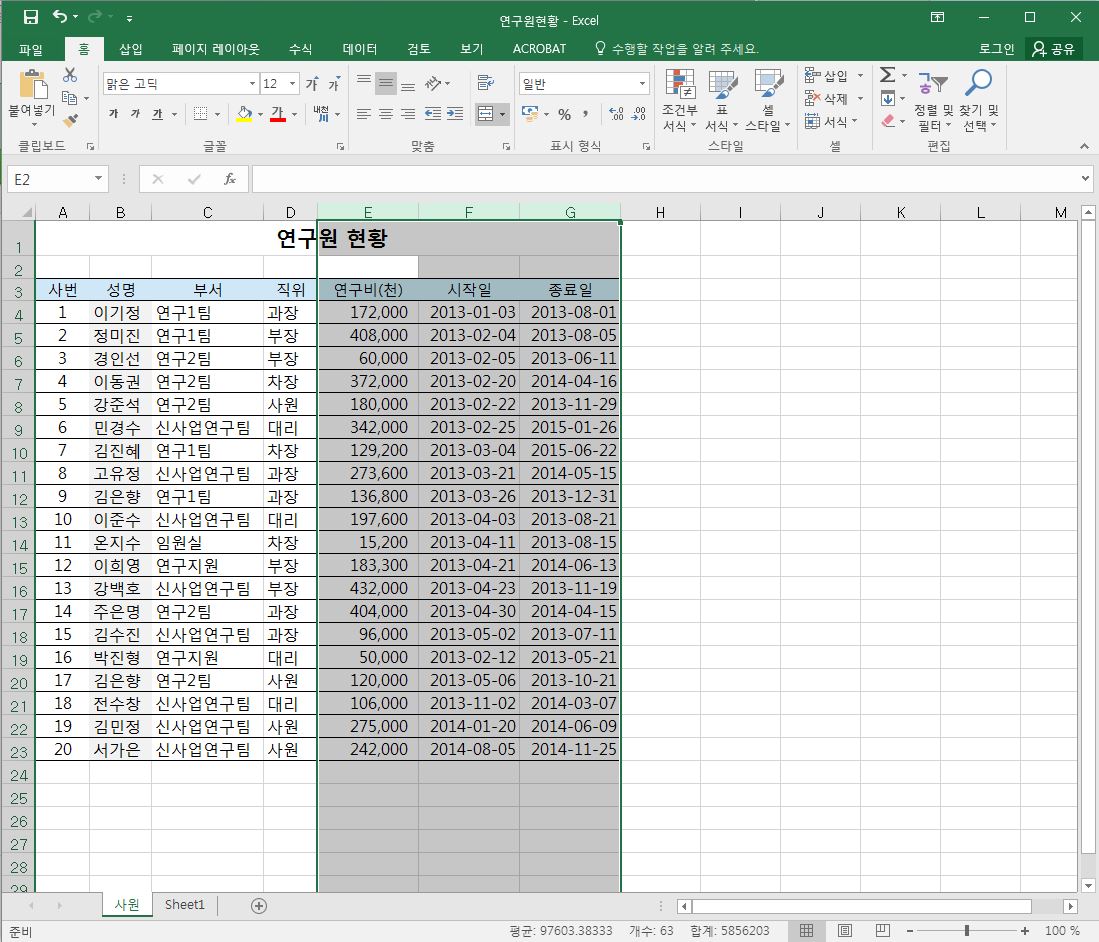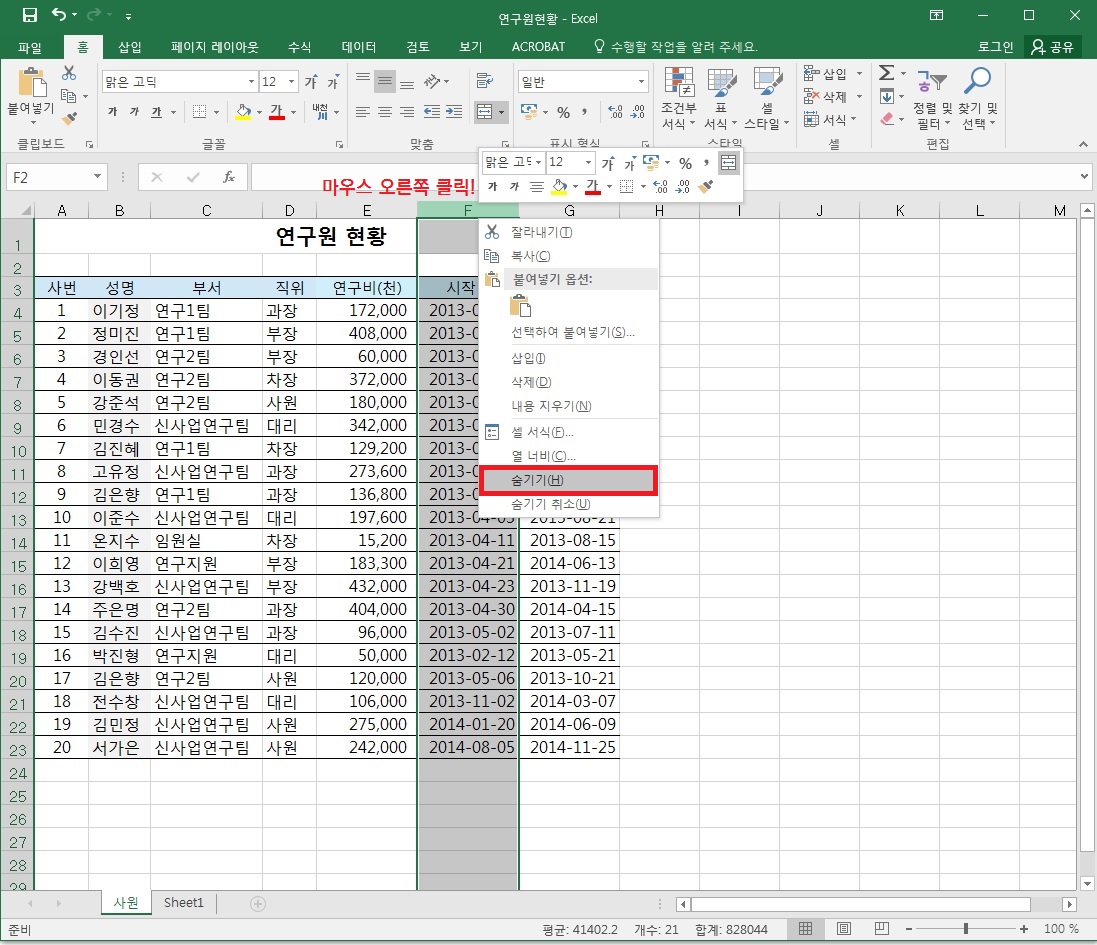 당장은 불필요한 데이터이고 보여지기 싫은 데이터지만 수식에 필요할 경우 유용하게 사용 가능해요. 열을 숨기는 방법은 간단합니다. 열을 선택한 후 마우스 우클릭하는 것이죠.