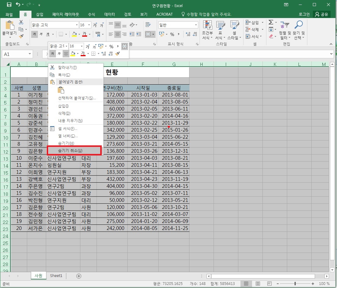 혹시 어떤 열이 숨겨졌는지 모른다면 전체 셀을 선택한 다음 숨기기 취소를 하면 쉽게 찾을 수 있어요. 어떤 엑셀 파일을 받았을때 혹시 모를 숨겨진 열을 찾고자 할때 사용하면 유용하답니다.