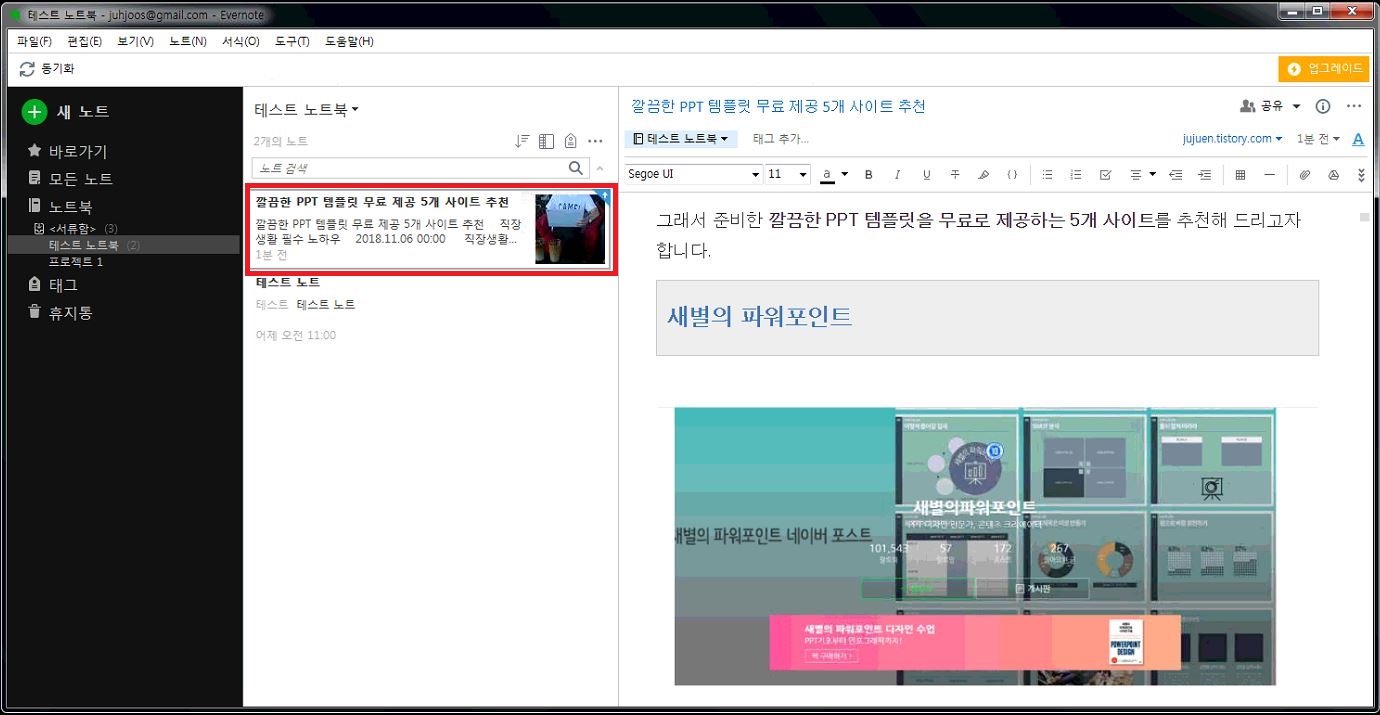 스크랩이 완료된 후 에버노트에 접속하면 아래처럼 웹페이지 제목으로 스크랩 된 노트를 확인 할 수 있어요.