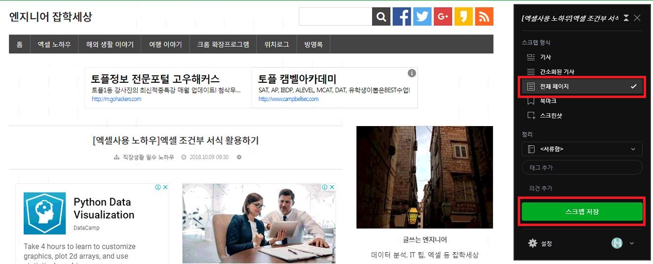전체페이지는 말 그대로 페이지 전체를 다 스크랩해서 노트에 저장하는 것이에요. 웹페이지 메뉴부터 이미지까지 모두 스크랩해요.