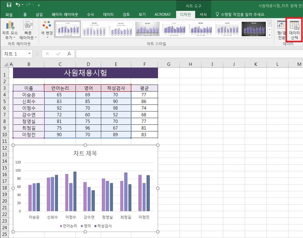 차트에 새로운 항목을 추가하기 위해서 [디자인]-[데이터 선택]을 클릭해주세요.