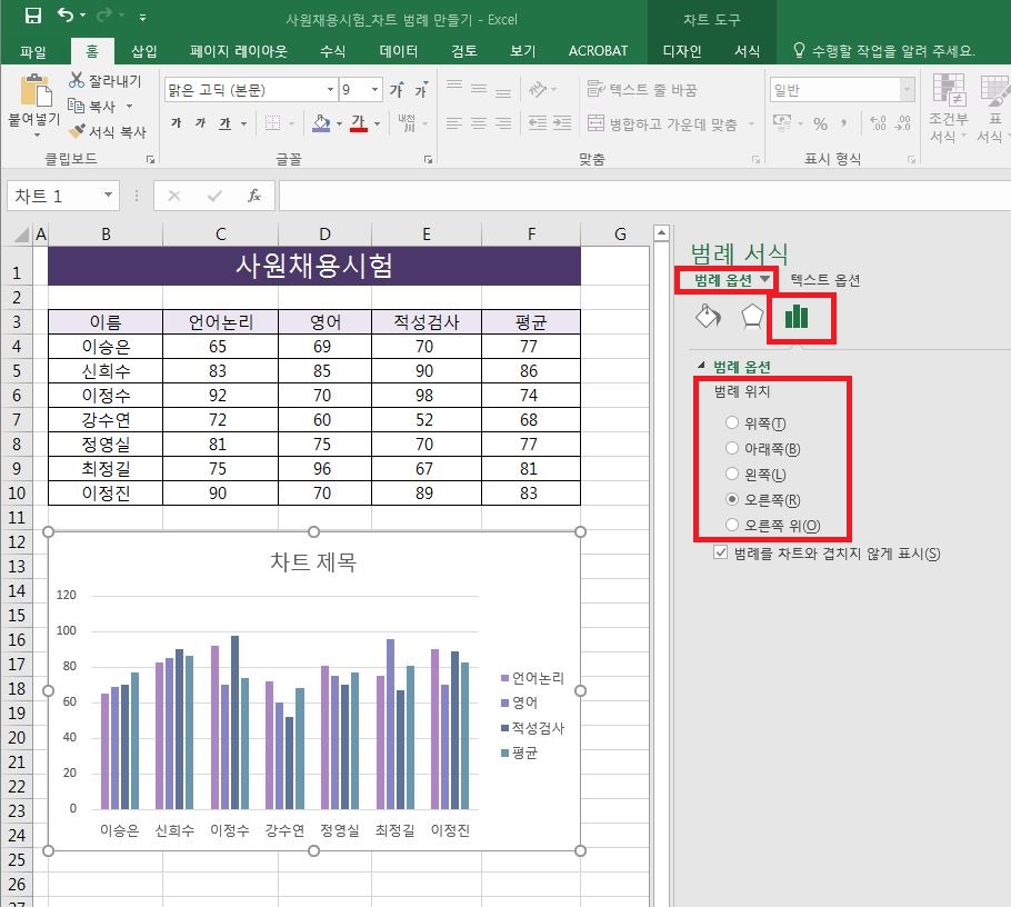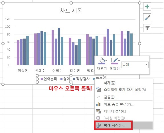 범례 색상 등을 바꾸기 위해서 차트의 범례를 클릭한 다음 마우스 오른쪽 클릭 후 범례 서식을 클릭해주세요.