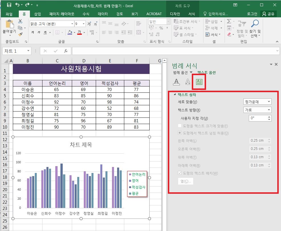 그리고 세번째에는 텍스트 상자의 맞춤, 방향 등 정렬 방식에 대해서 수정할 수 있어요.