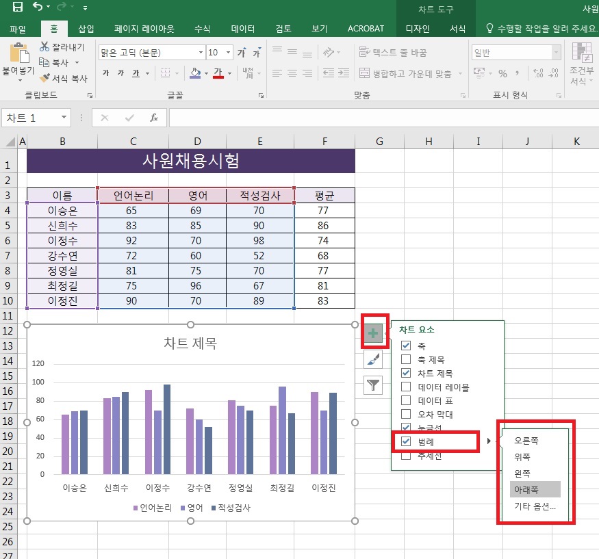 먼저 범례 위치 변경입니다. 차트를 클릭한 다음 오른쪽의 +를 클릭한 후 범례를 클릭하면 오른쪽 창에서 범례 위치를 쉽게 바꿀 수 있습니다.