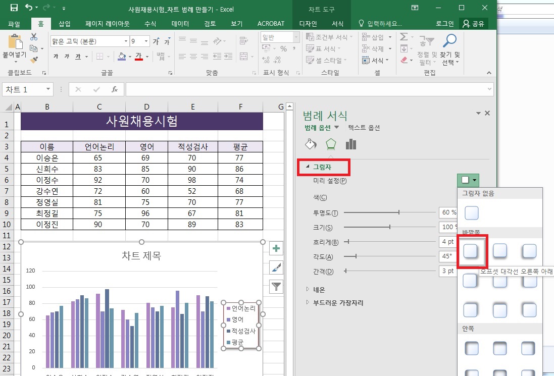두번째는 그림자로서 범례의 그림자 옵션을 설정할 수 있어요. 다양한 설정 방법이 있으니 원하시는 모양으로 만드시면 됩니다.