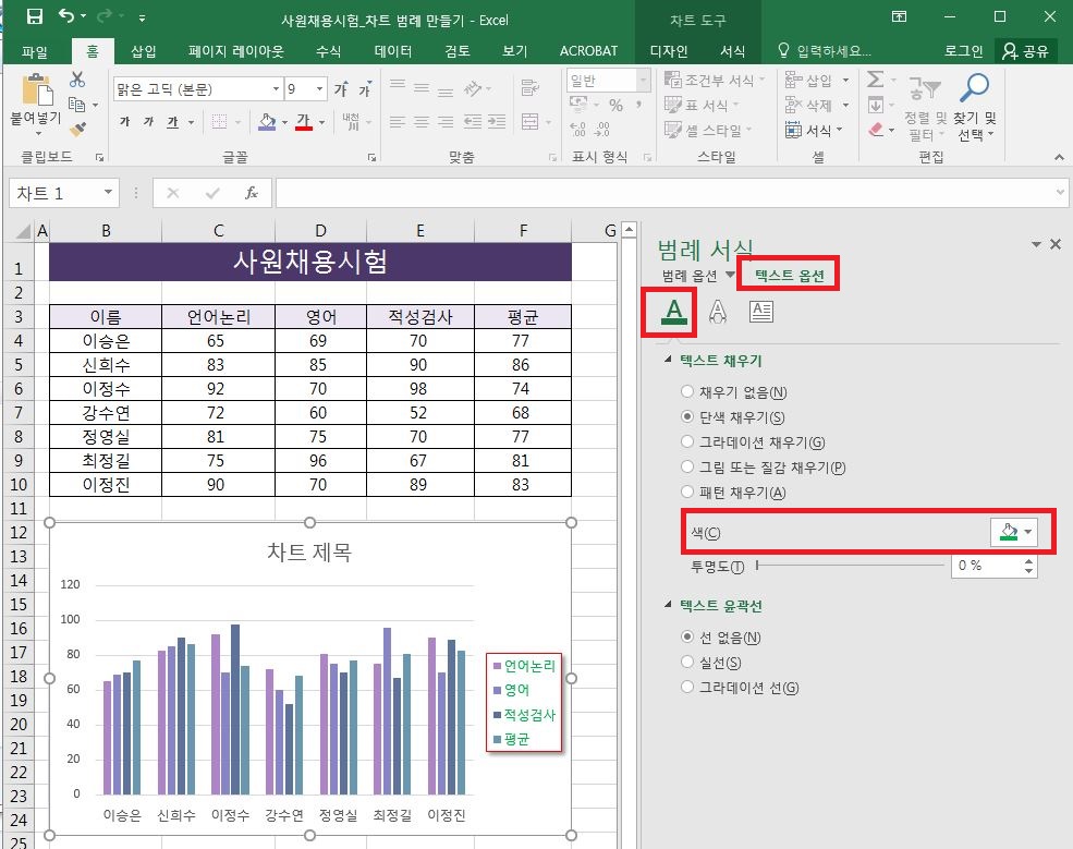 텍스트 옵션 첫번째는 텍스트의 색상과 윤곽선을 변경할 수 있어요.