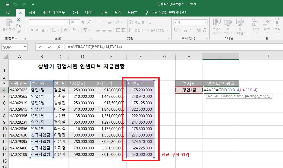 이제 마지막 인수에요. 평균 값을 구할 범위를 지정해주면되요. 평균을 구할 값은 인센티브이기 때문에 인센티브 범위를 지정해주세요.