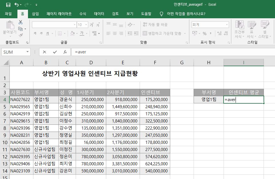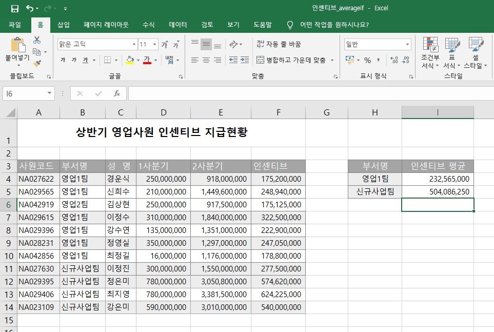 그럼 아래처럼 원하는 조건인 영업1부 인센티브의 평균을 구할 수 있어요. 영업1부 외에도 추가로 신규사업팀을 넣어서 평균 값을 구할 수 있어요.
