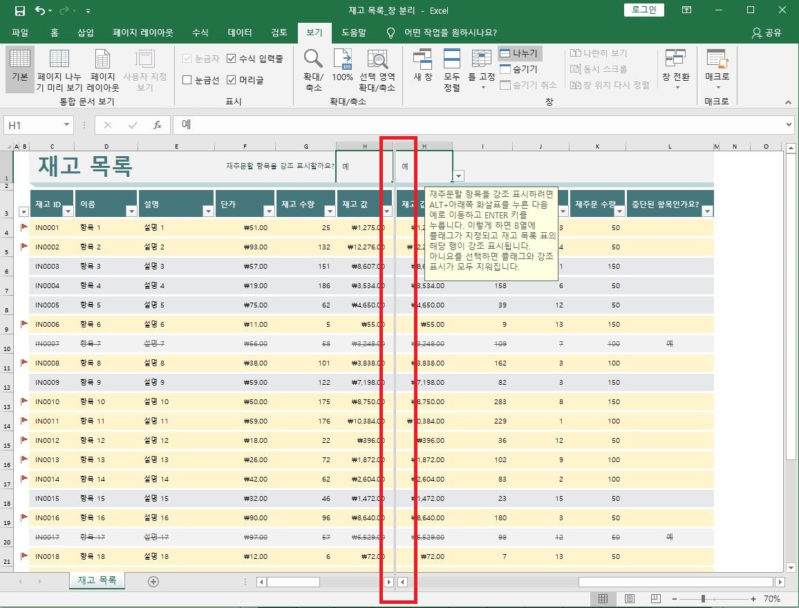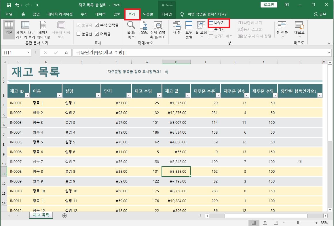 예제파일을 다운 받은 후 열어주시면 아래와 같은 재고목록 파일을 볼 수 있어요. 이 엑셀파일의 창을 4개로 먼저 나누어 보겠습니다.