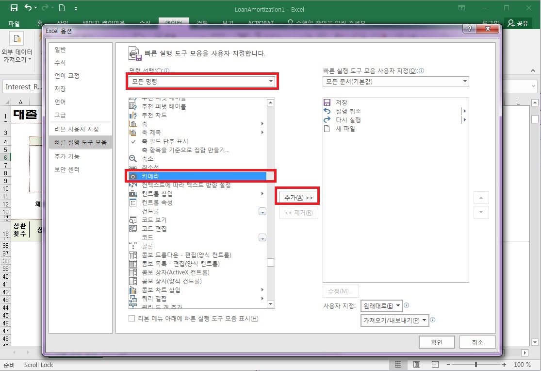 왼쪽 메뉴에서 [빠른 실행 도구 모음]을 선택해 주세요. 그리고 모든 명령 중 카메라를 찾은 다음 추가를 클릭해주세요.