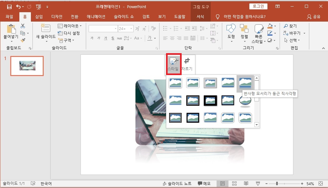동일하게 그림을 클릭한 다음에 [스타일]을 클릭해서 원하는 스타일을 선택하면 되요.