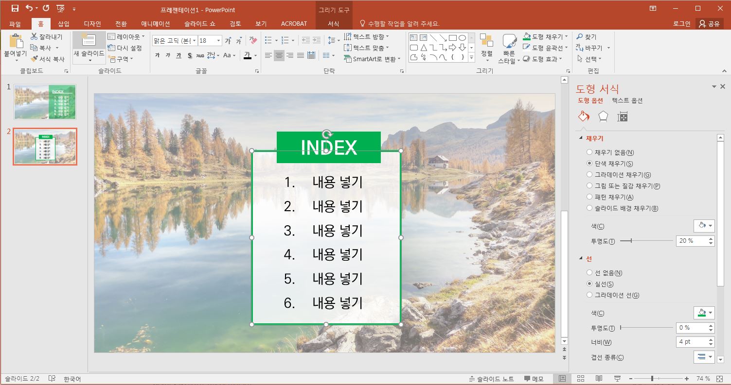 사각형 배경은 흰색으로하고 투명도는 30% 그리고 선은 초록색으로 했어요. 개인적으로 아래 처럼 박스를 만들어서 목차를 넣는게 제일 깔끔하고 이쁘더라구요.