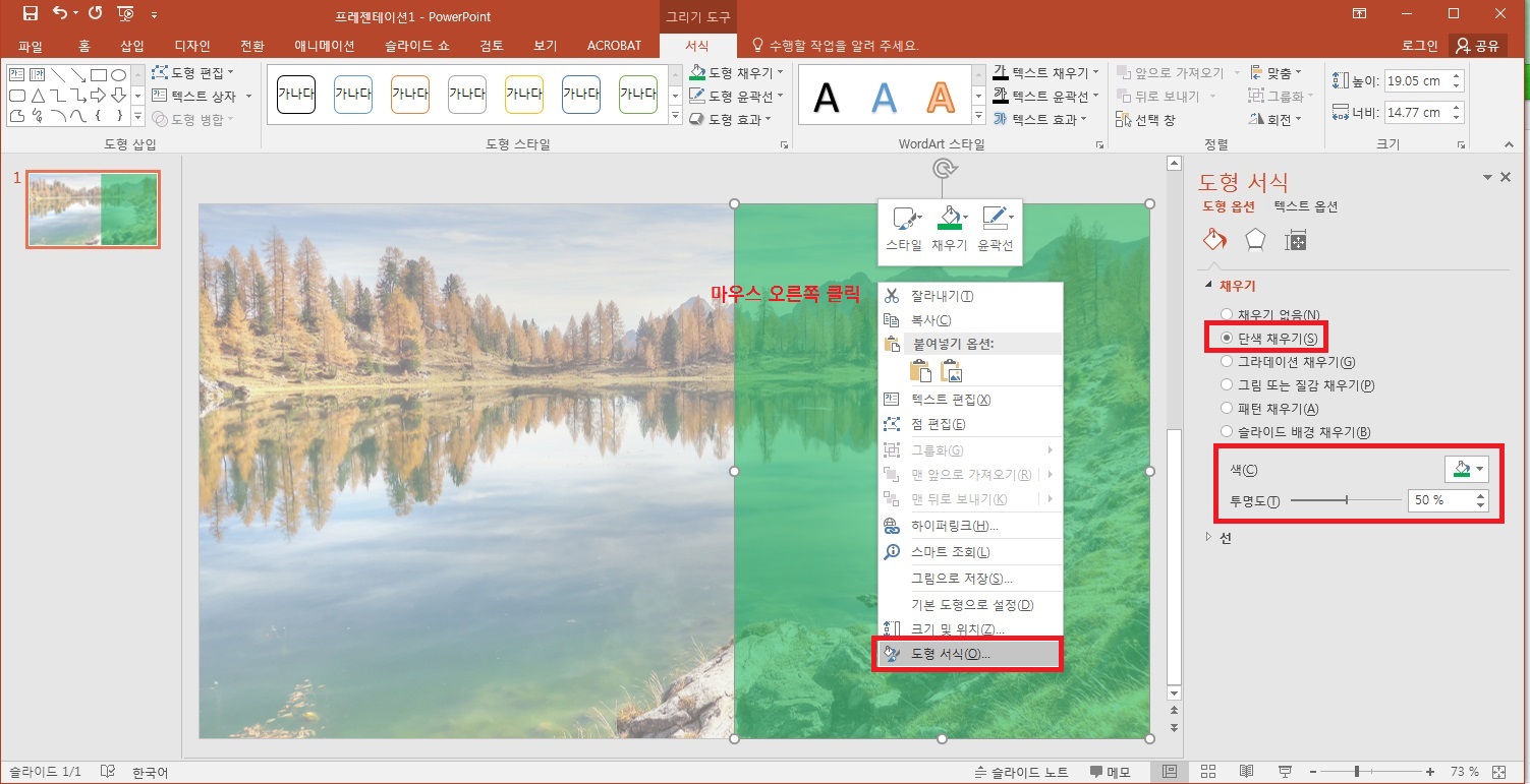 도형을 클릭해서 마우스 오른쪽 클릭-도형 서식에 들어가주세요. 도형 서식에서 전체 채우기를 선택하여 색상을 지정하고 투명도를 50%로 변경하면 됩니다.