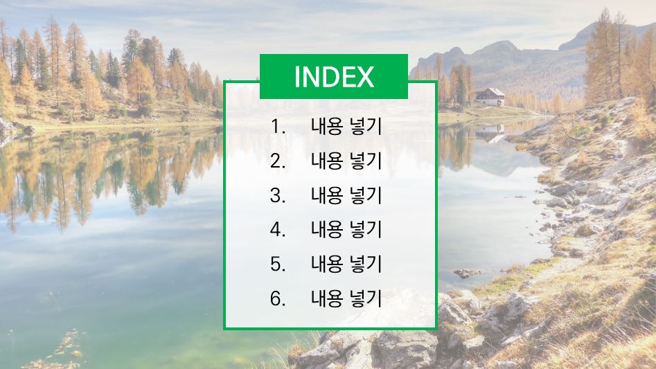 도형을 활용하면 아래처럼 깔끔한 목차도 만들 수 있습니다. 사각형 도형을 넣고 색상과 투명도만 조절해도 이쁜 목차를 만들 수 있어요.