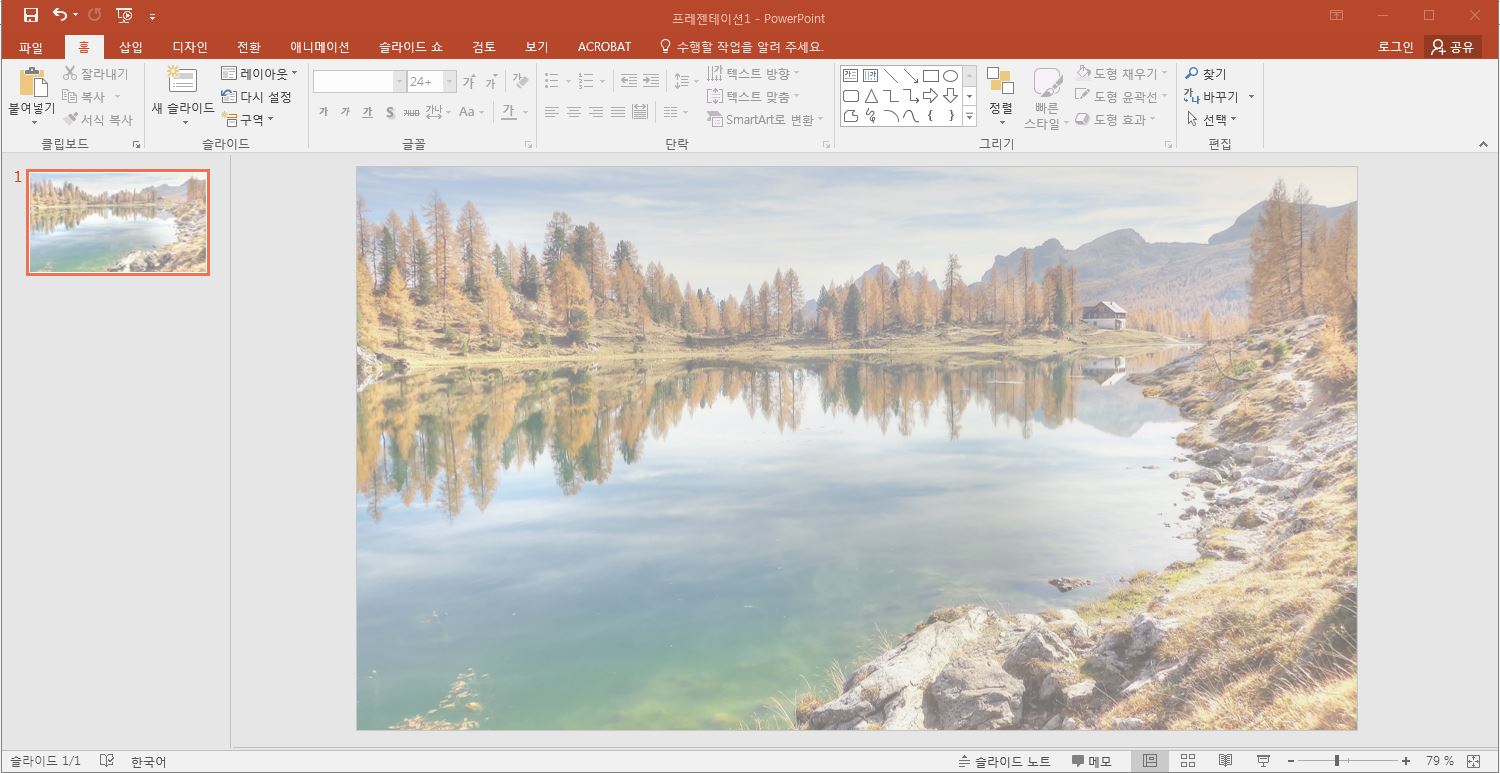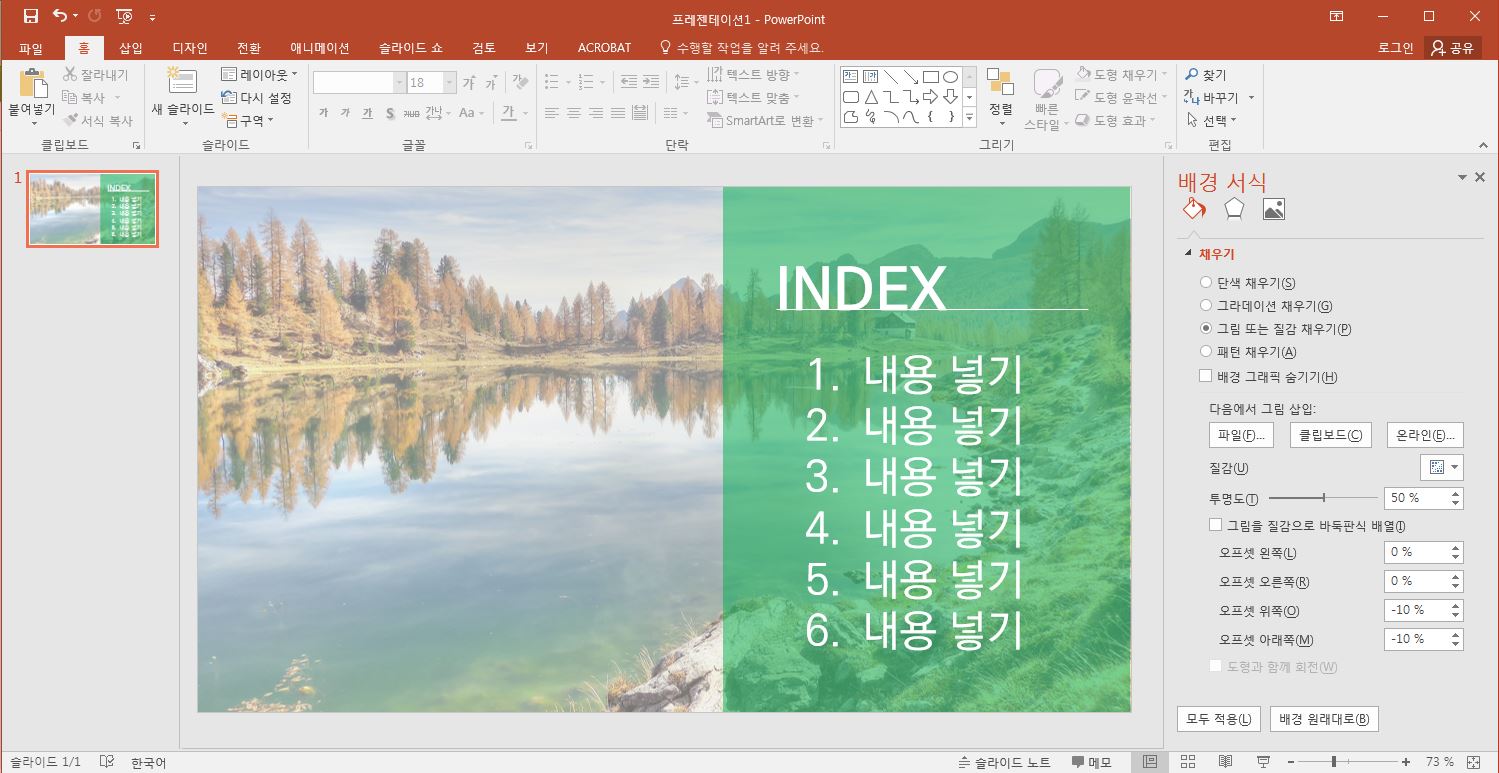 배경 이미지를 이용해서 PPT 목차를 만들어 보겠습니다. 먼저 배경 이미지를 ppt 배경으로 넣은 후 투명도를 설정해주면 아래와 같이 변경됩니다.