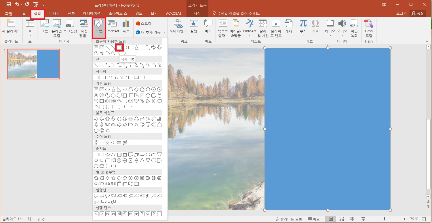 그 다음 [삽입]-[도형]에서 사각형을 선택하여 오른쪽에 넣어주세요.