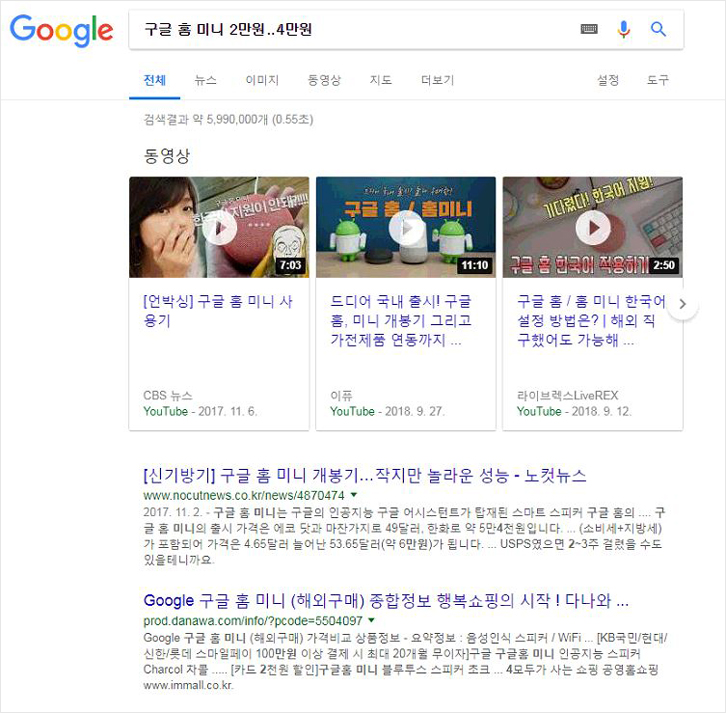 뿐만 아니라 "구글 홈 미니 2만원..4만원"이라고 검색하면 검색 결과에 해당 금액 사이의 결과를 찾을 수 있어요. 물론 불가능한 금액을 적으면 이상한 결과가 나오겠죠?