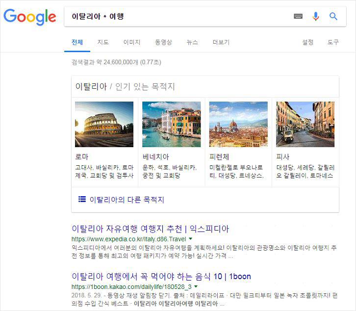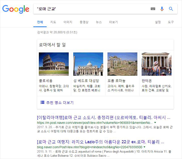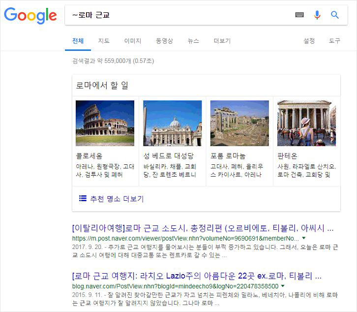 검색어 앞이나 뒤에 ~(물결)을 넣어주면 검색어와 비슷한 단어를 가진 결과를 찾을 수 있습니다. 저는 "~로마 근교"로 검색했는데 이와 비슷한 검색 결과를 보여주네요.