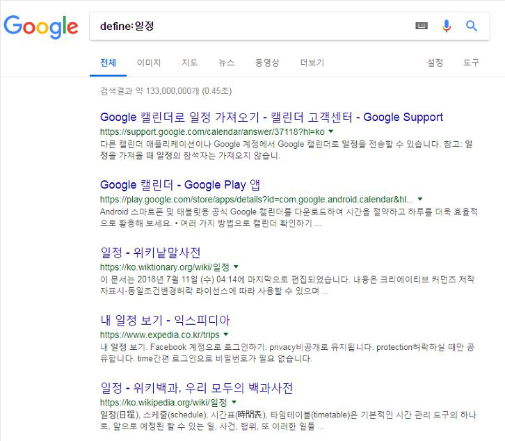 원하는 검색어에 대한 정의를 검색하기 위해서는 define:(검색어)를 입력해 주시면 됩니다. 사실 그냥 검색해도 정의가 나오긴 하는데 가끔 이상한 결과가 나올때도 있기 때문에 define을 사용하시면 더 정확하게 결과를 얻을 수 있어요.