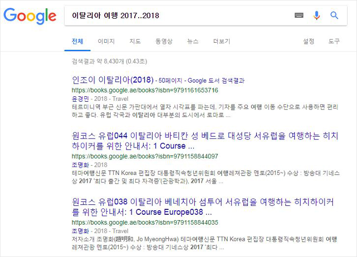검색어와 검색어 사이에 " .."을 넣어주면 그 사이의 결과물을 얻을 수 있어요. 아래 처럼 "2017년..2018년"을 검색하면 2017년부터 2018년 사이의 검색 결과만 골라서 찾을 수 있어요.