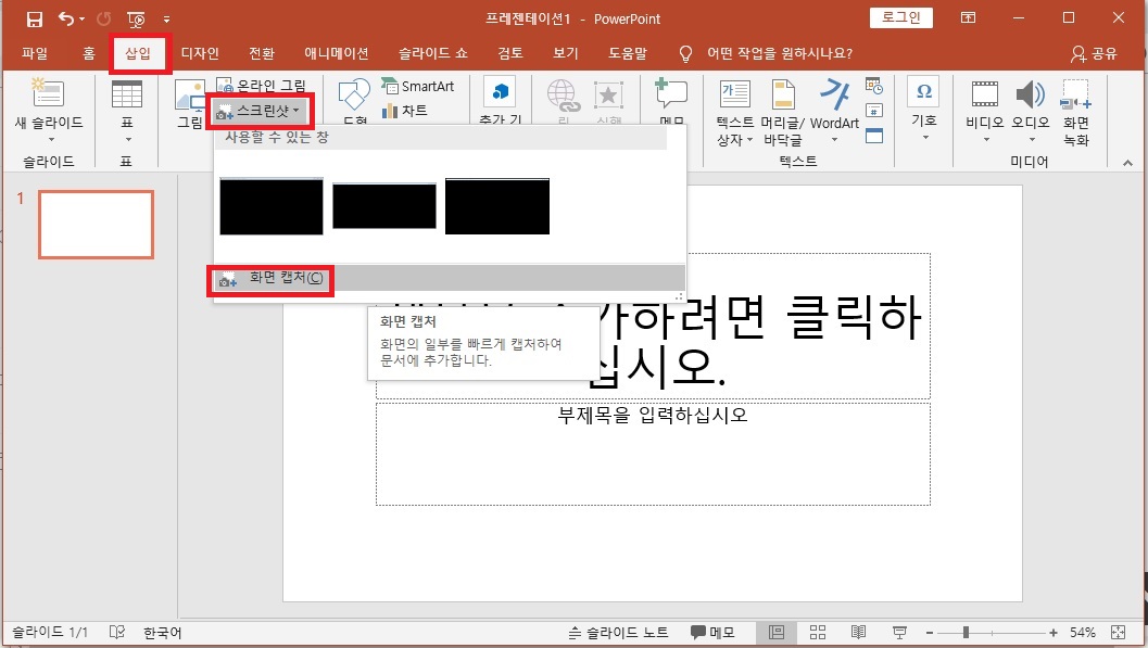 원하는 화면을 캡쳐하기 위해서 파워포인트 상단의 메뉴에 [삽입]-[스크린샷]-[화면 캡쳐]를 클릭해주세요.