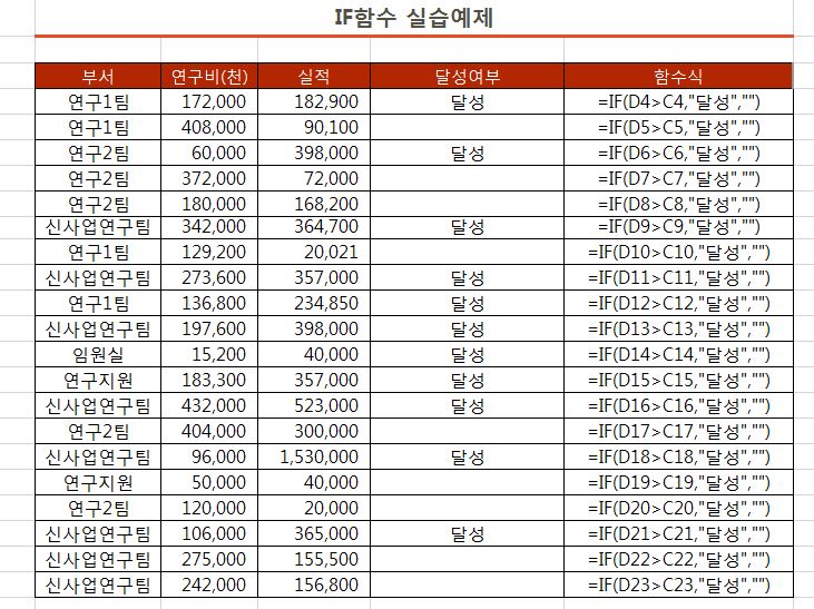 조건문은 실적(D열)보다 연구비(천)(C열) 크다면 참으로써 달성, 그렇지 않다면 거짓으로써 빈칸으로 둬라고 작성할 것입니다.