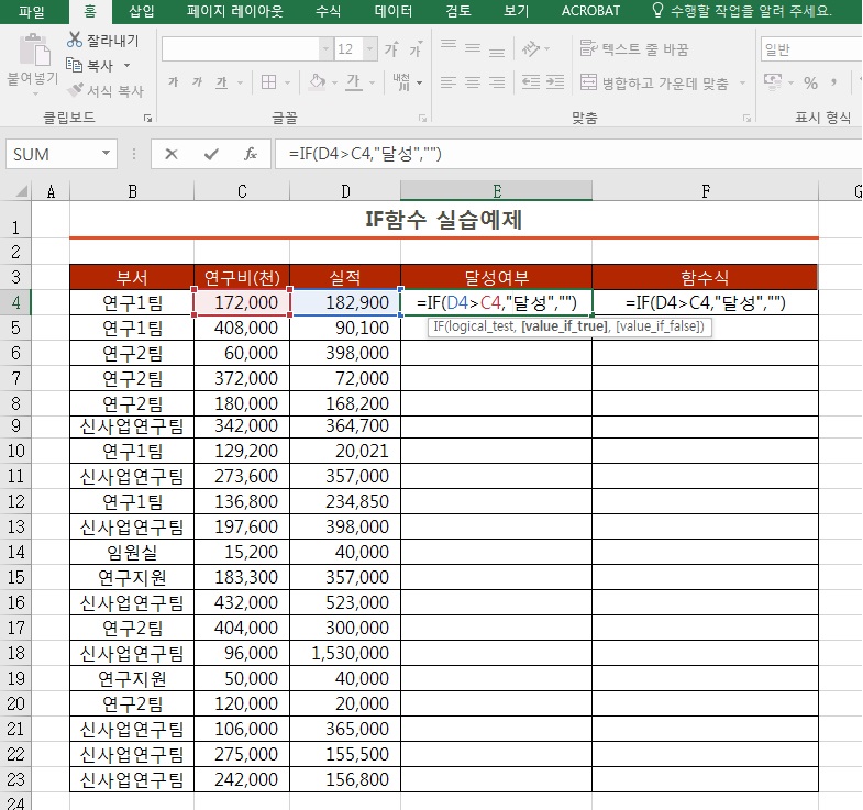 실적이 연구비(천)보다 초과하는 경우 달성으로 함수가 적용된 것을 확인 할 수 있습니다.