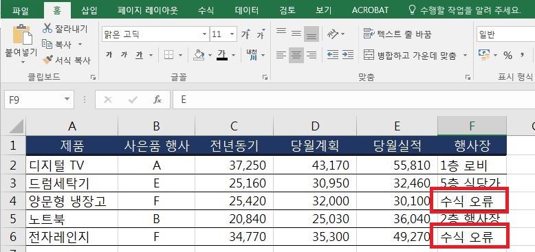 아래와 같은 화면에서 2개의 셀에 #N/A 오류가 나타난 것을 볼 수 있어요. 오류가 난 이유는 사은품 행사와 맞는 값을 찾는 HLOOKUP 함수인데 F는 아래 표에 없는 값이라 #N/A 오류가 발생했네요.