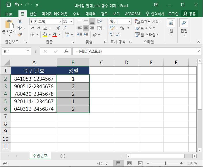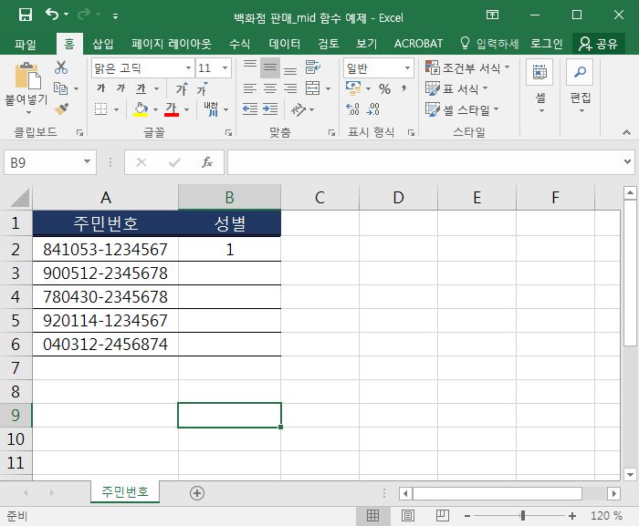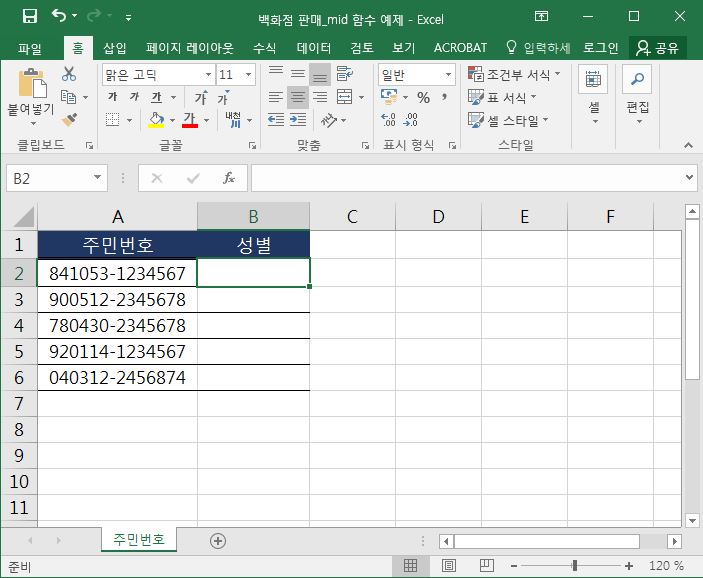 본격적으로 예제파일을 통해서 mid함수 사용방법을 알아보겠습니다. 예제파일을 열면 아래 처럼 주민번호와 성별 열을 볼 수 있습니다. 여기서 성별을 의미하는 1 또는 2를 mid 함수를 통해서 추출할 예정입니다.