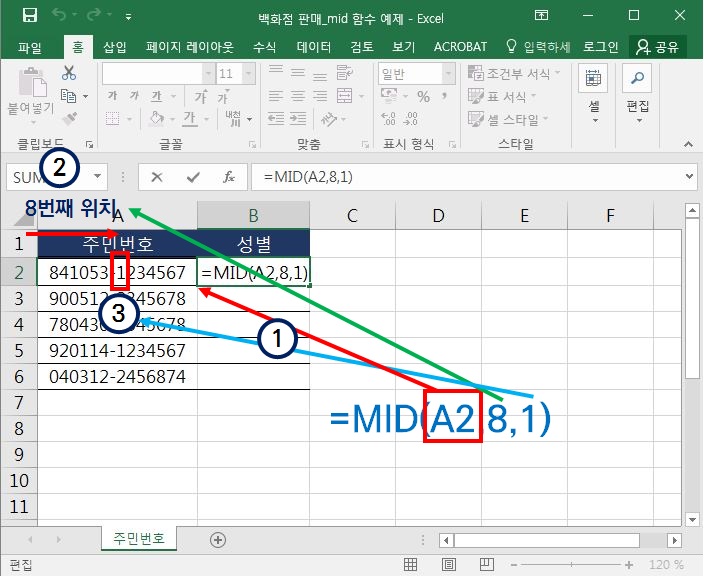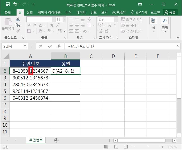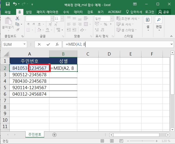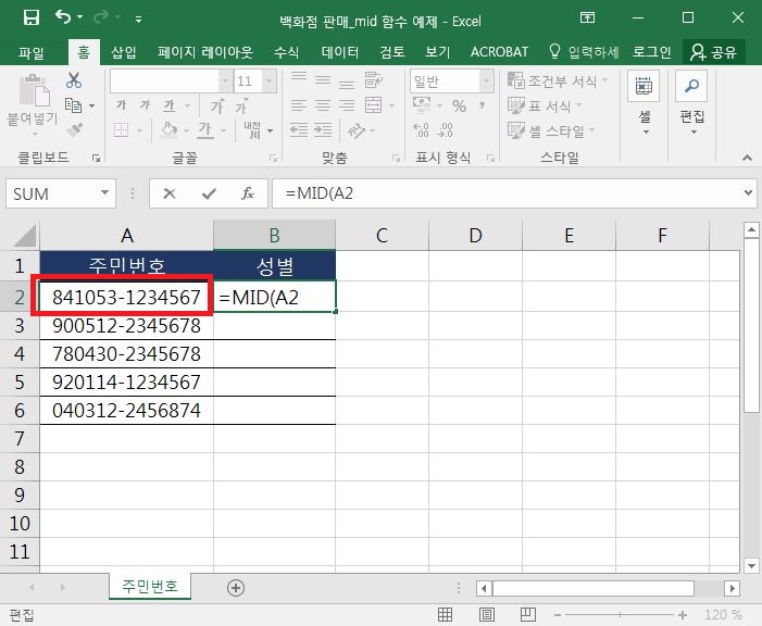 본격적으로 mid함수를 사용해 보겠습니다. 먼저 첫번째 인수에 A2 즉 주민번호 텍스트를 넣어주세요.