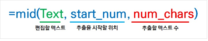 MID 함수는 주어진 문자열에서 원하는 시작점부터 원하는 글자 수 만큼 가지고 올 수 있는 함수입니다. 물론 한 글자만 가져올 수도 있고 원하는 글자 수에 따라 다르게 가지고 올 수 있습니다.