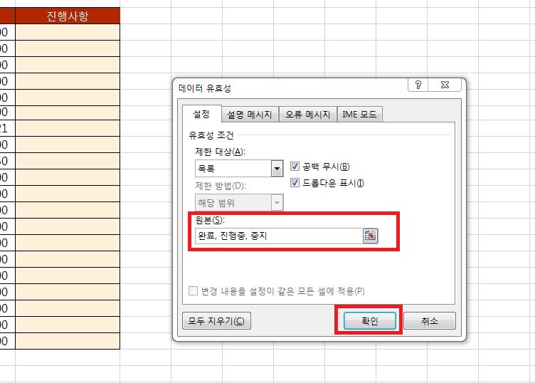 그 다음 드롭다운 목록에 나타날 데이터를 입력해야 합니다. 원본에 [완료, 진행중, 중지]를 입력해주세요. 만약 해당 데이터가 셀에 입력되어 있으면 그 셀의 범위를 선택해 주셔도 되요. 입력 완료 되셨다면 확인을 클릭합니다.
