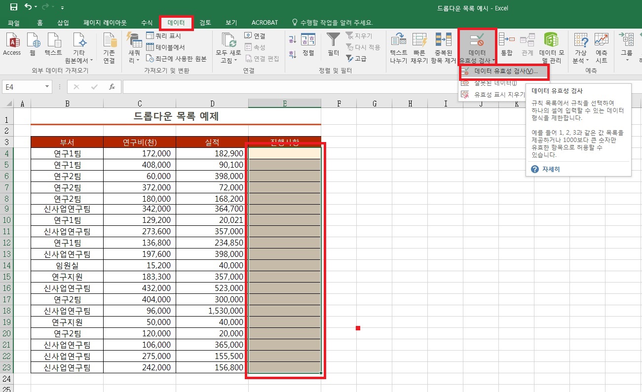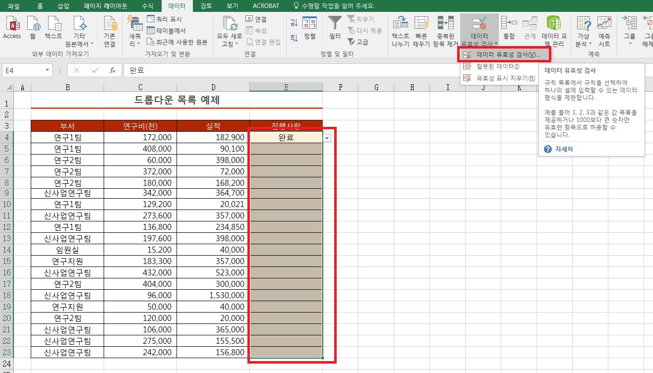 이번에는 드롭다운 목록을 삭제해 보겠습니다. 유효성 검사 삭제와 동일하게 해당 셀을 선택하신 다음 [데이터]-[데이터 유효성 검사]를 클릭해주세요.
